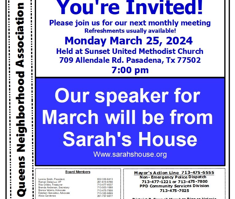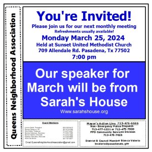 Join us on Monday, March 25th, 2024 at 7PM for our monthly Queens Neighborhood Association meeting. We will have a special guest speaker from Sarah’s House. Meeting will be held at Sunset United Methodist Church. Address is 709 Allendale, Pasadena TX. 77502.
